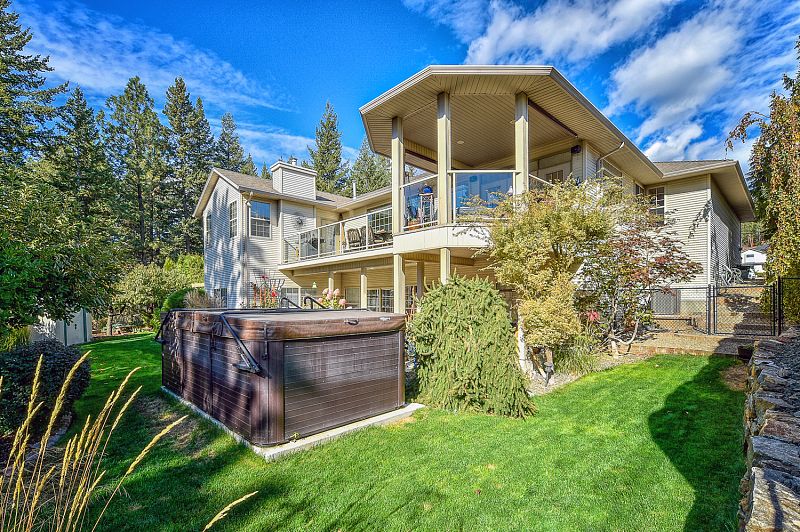 Yard is beautifully manicured, fully fenced backyard. Fruit trees, grape vines, backing onto Smith Creek.